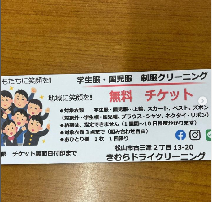 なんと学生服・園児服のドライクリーニング無料チケットをご提供くださることになりました‼︎
