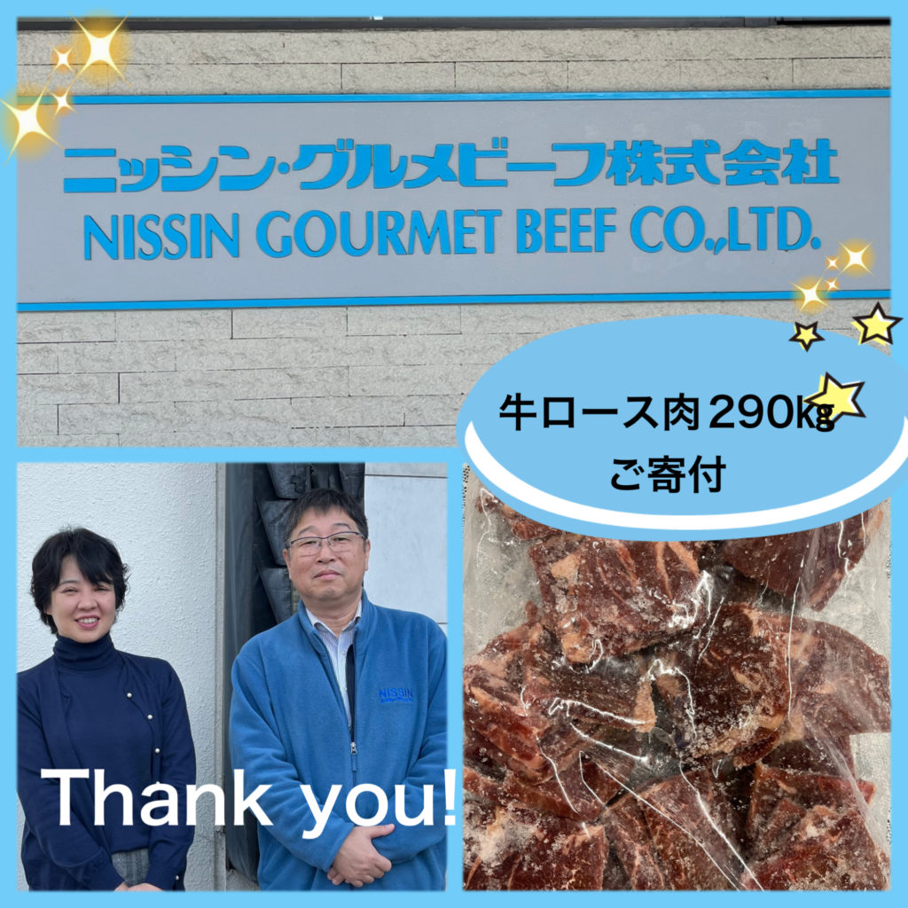 ニッシン・グルメビーフ株式会社さまより 2026.01.15 ニッシン・グルメビーフ株式会社さまより 牛肩ロース290キロを寄付したいただきました。 たくさんの食堂でご馳走をお出しすることができました!ありがとうございました。
