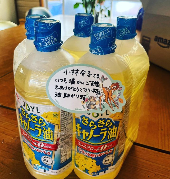 小林令子様より 2023.07.12 小林令子さまが油5本をプレゼントしてくださいました。小林さま、温かい継続的なご支援をありがとうございます!来月は安納芋のプライドポテトを予定していますので大変助かります!