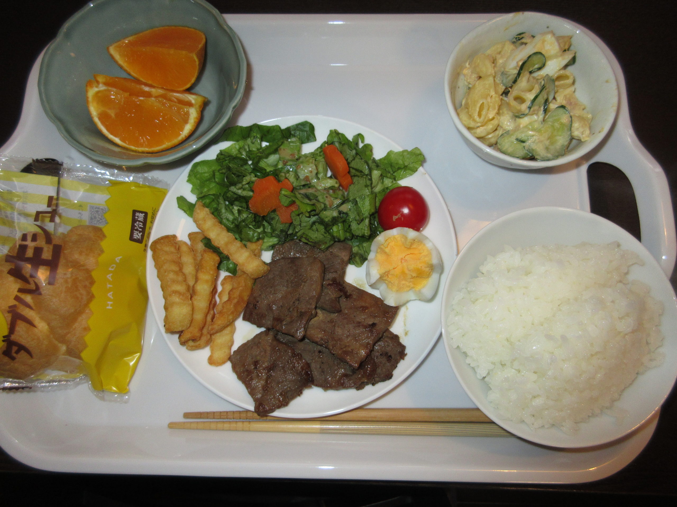 焼肉・サラダ(2種類)・ポテトチップス・愛果28号・シュークリームを29食提供しました(^o^)
