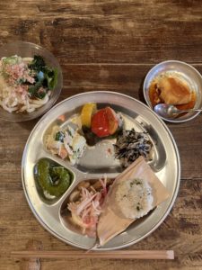 島野菜大根おろし2種冷やしうどん、きゅうり半分漬け、春雨とひじき、カポナータ、野菜とツナのサラダ、鰯フライ南蛮漬け、玄米おこわおにぎりワカメ入り、カスタードプリンを3