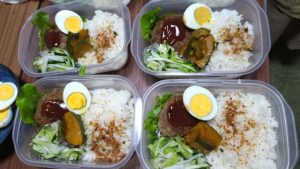 ごはん、ハンバーグ、ゆで卵、かぼちゃとズッキーニの煮