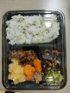わかめごはん、肉じゃが、ひじきの煮物、きゅうりとツ