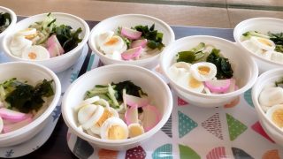12:00〜13:30 冷やしサラダうどん、さんまの竜田揚げを25食提供しました(^O^)☆